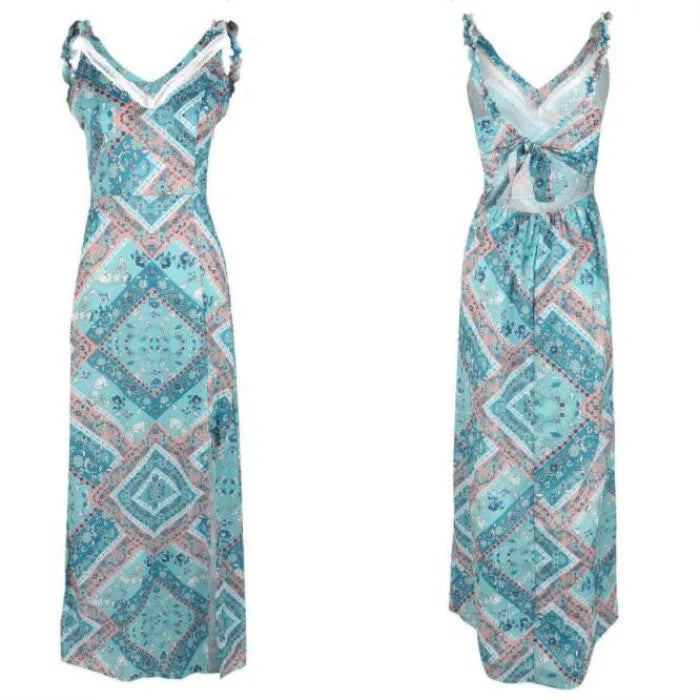 Women Sexy Backless Dress 2019 Summer Bohemian Floral Print Long Dresses Femal V Neck Vestidos Plus Size Lady Casual Clothes
