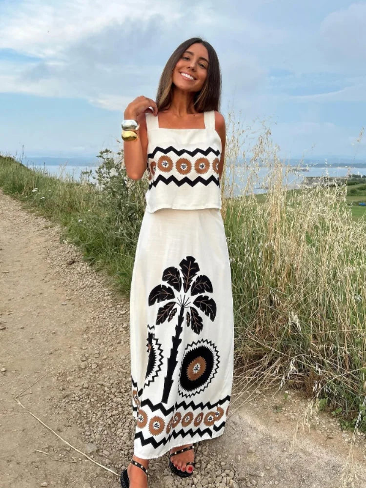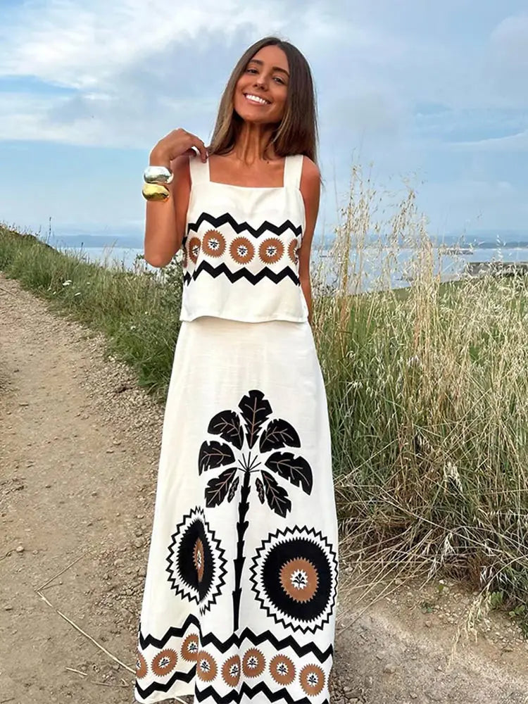 Women's Fashion Off Shoulder Square Neck Top Set Casual Printed High Waisted Skirt Suits 2024 Summer Lady Beach Vacation Outfits