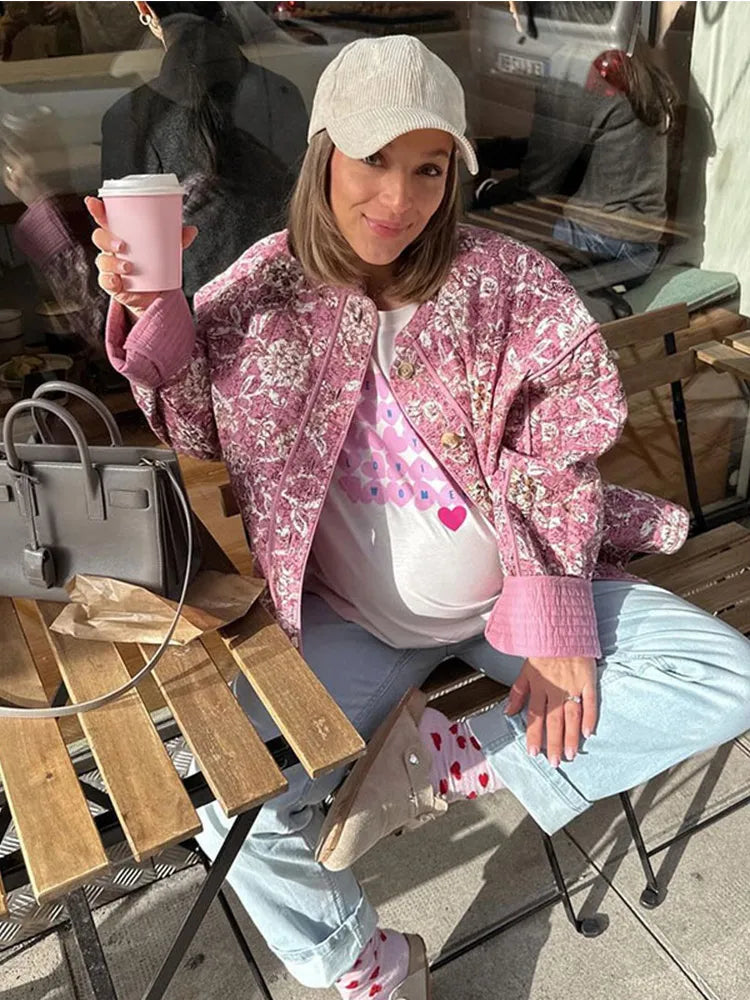 Women's Quilted Jacket Fall Winter New Floral Print Thickened Stand-up Collar Cotton Jacket Fashionable Outerwear Jacket