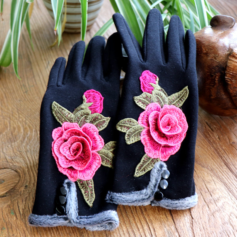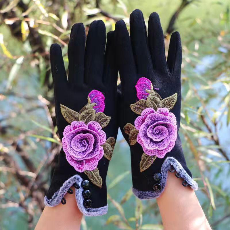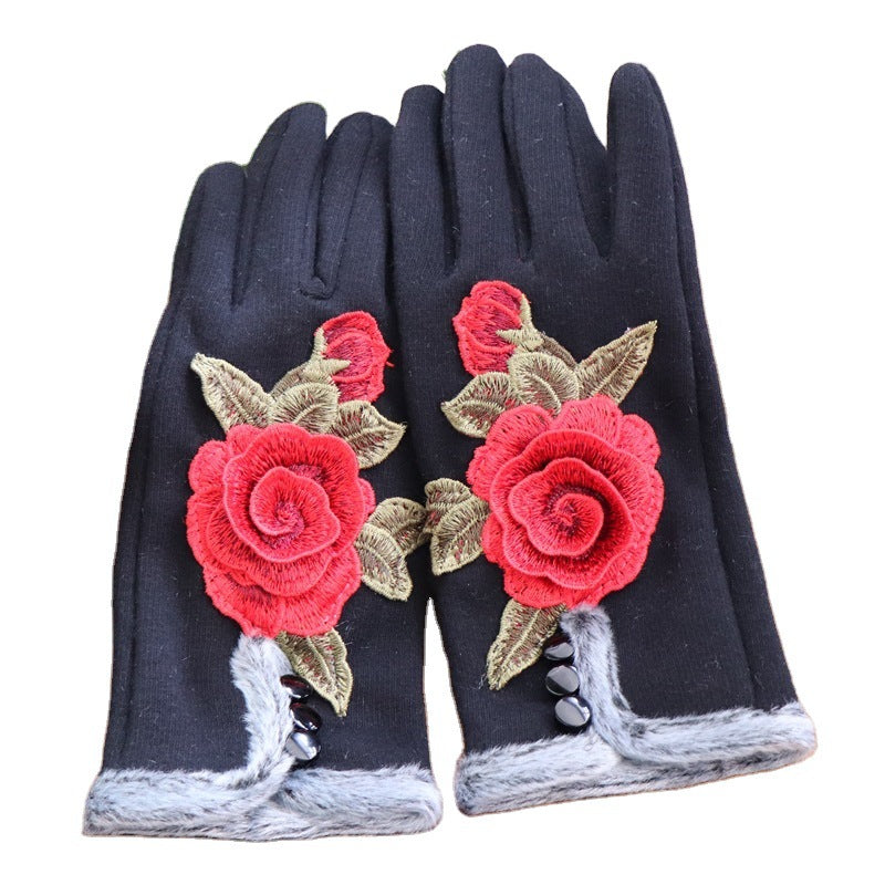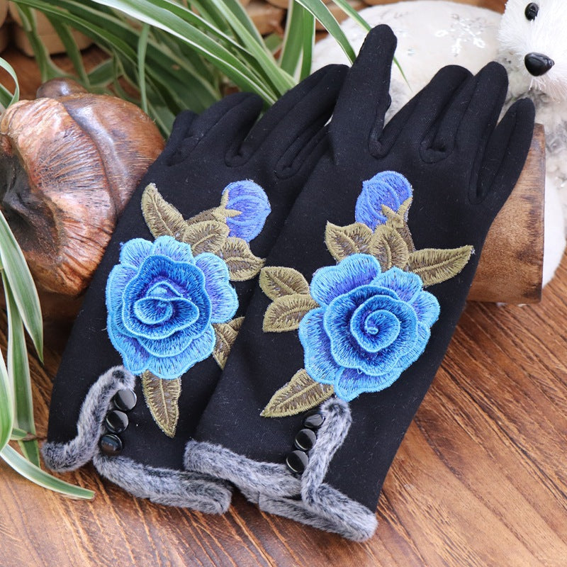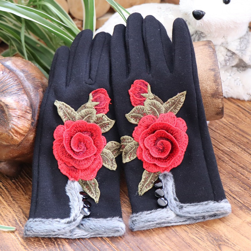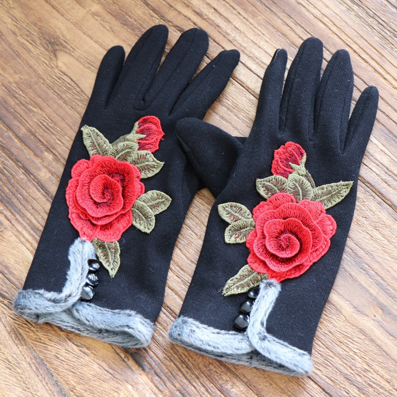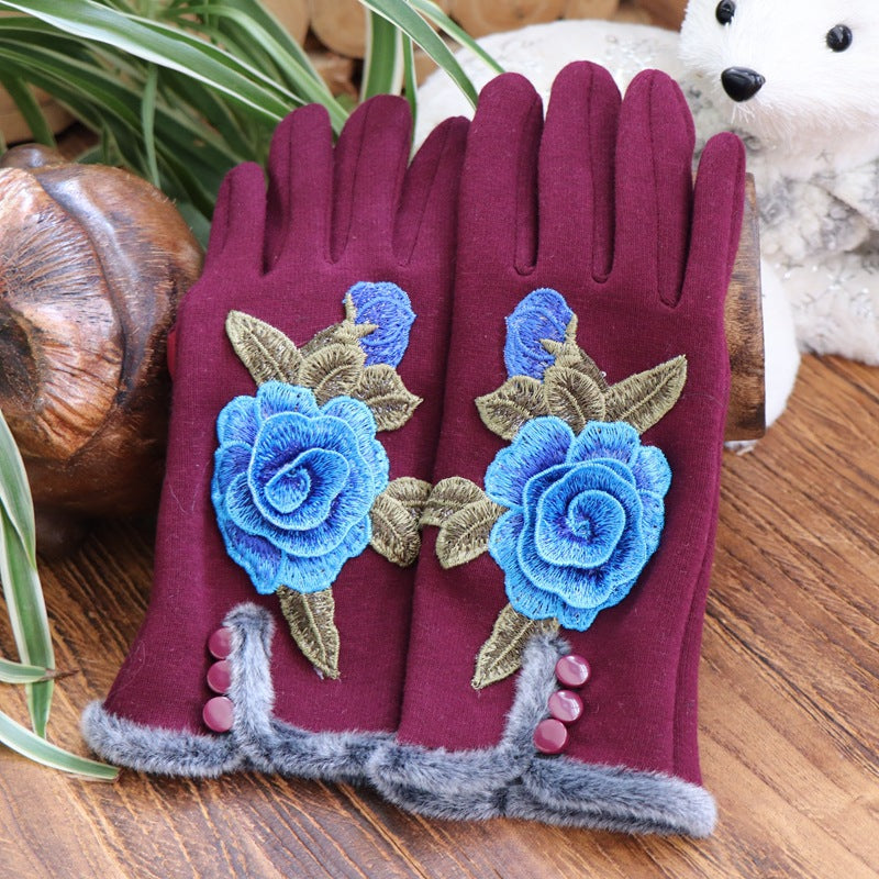Ethnic Embroidery and Velvet Warm Embroidery Gloves Refer To Touch-screen Gloves and Velvet Cycling Five-finger Gloves