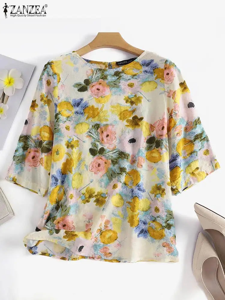 Women Cotton Linen Blouses 2024 Summer Bohemian Floral Printed Blusas Fashion 3/4 Sleeve O-Neck Top Casual Loose Shirts