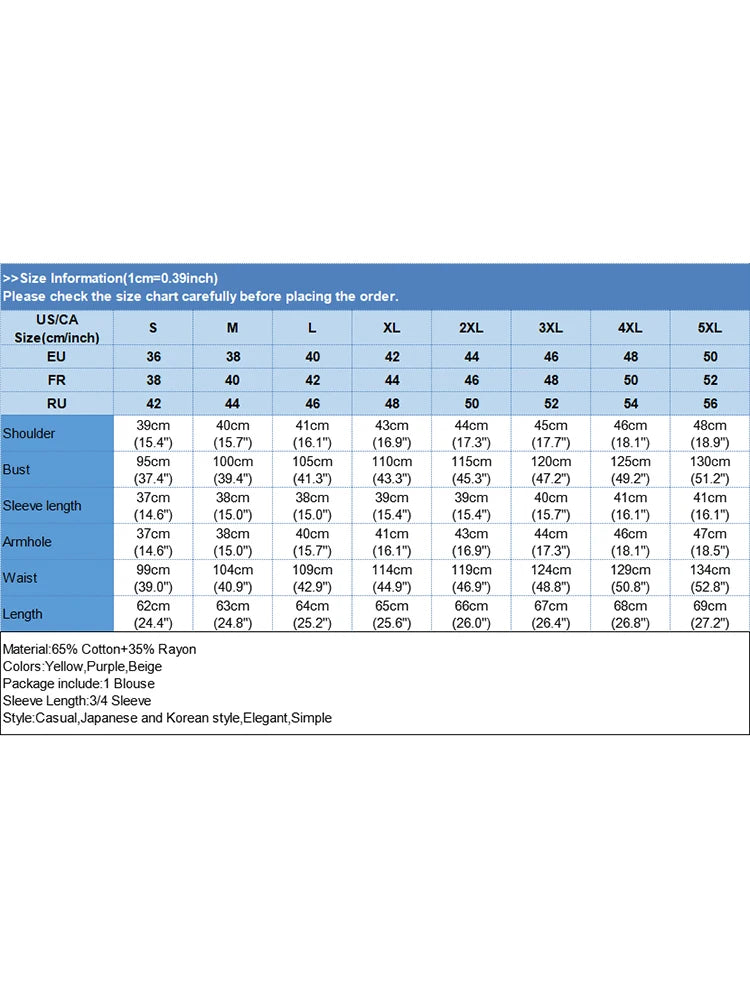 | "Item Type:Blouse Material:65% Cotton+35% Rayon Colors:Yellow,Purple,Beige Package include:1 Blouse Cutting:Regular Collar:Round Neck Sleeve Style:Regular Sleeve Length:3/4 Sleeve Pattern:Solid Thickness:Thin Style:Casual,Japanese and Korean style,Elegant,Simple Season:Spring,Summer Occasion:Daily,Simple,Casual Label: Yes Attention: 1. Due to different computers, there may be subtle color difference between the object and the image. Please don't shoot if you mind. Thank you. 2. There may be manual measurement error of 1-3cm. Please understand the inconvenience. 3. Please refer to the real object. The model pictures are for reference only. 4. Attention!!! Please check the size chart carefully before ordering."