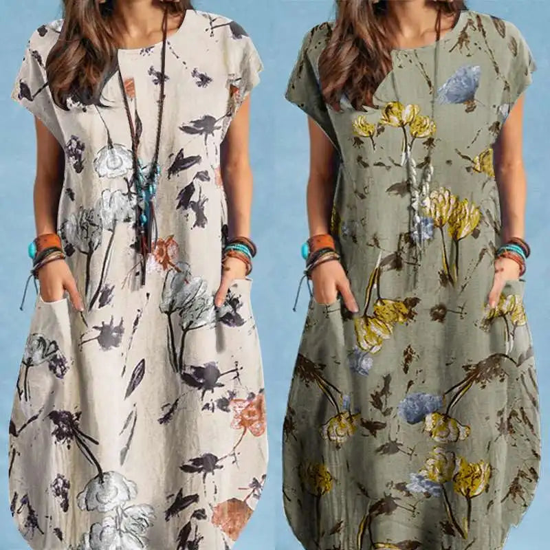 ZANZEA Women Summer Dress Bohemian Floral Print Vestido O-Neck Short Sleeve Pockets Sundress Fashion Casual Elegant Holiday Robe